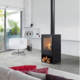 Fogão a lenha Rocal Habit 50 V com uma potência de 8,7 kW e um rendimento de 86,3% com sistema de dupla combustão, combustão estanque e vidro limpo.